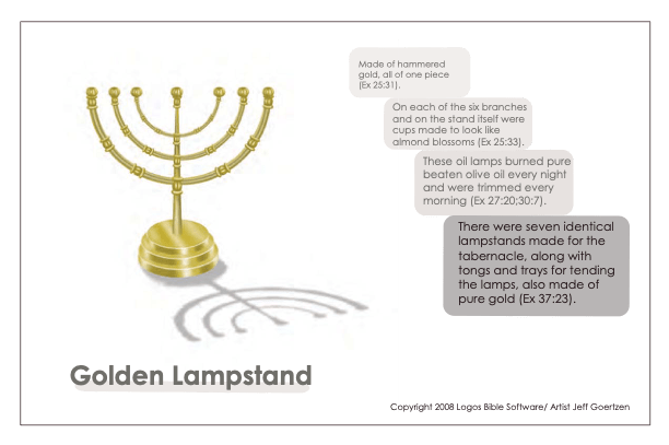 The lamp stand was an oil lamp. Each of the flower-shaped cups held a measure of olive oil and a cloth wick. When the wick becomes saturated with oil, it would be lit and give off a small flame. The priests were to keep the lamps burning continually symbolizing God’s everlasting giving of life and light to His people.